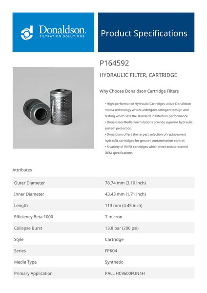 Genuine Donaldson P164592 Hydraulic Filter, Cartridge is designed to provide superior protection for your hydraulic system, effectively capturing contaminants to ensure clean fluid circulation. With high-quality filtration media, it extends equipment life, improves operational efficiency, and maintains fluid cleanliness even in the most demanding environments.Built for industrial, agricultural, and heavy-duty applications, this filter offers excellent dirt-holding capacity and flow efficiency. Its easy installation and maintenance help reduce downtime, making it a reliable choice for keeping hydraulic systems running smoothly.
