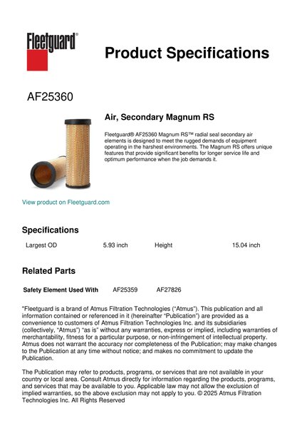 Fleetguard® AF25360 Magnum RS™ radial seal secondary air elements is designed to meet the rugged demands of equipment operating in the harshest environments. The Magnum RS offers unique features that provide significant benefits for longer service life and optimum performance when the job demands it.