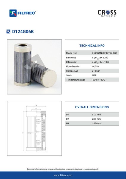 Genuine Filtrec D124G06B. This Filtrec element is designed to meet or exceed the quality and performance of brand OEM’s ensuring superior filtration performance and long-lasting durability.Engineered with their high performance media and a durable design, the D124G06B provides reliable and consistent performance over its lifespan, even in harsh operating environments. When you order from FilterFinder, you can trust that you are getting a reliable and high-quality replacement filter that will keep your system running smoothly.
