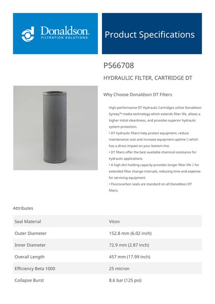Genuine Donaldson P566708 Hydraulic Filter, Cartridge Dt is engineered with advanced depth filtration technology, offering enhanced dirt retention and fluid cleanliness. It ensures optimal performance in high-pressure hydraulic systems, effectively protecting critical components from wear and extending system life.This filters robust construction and superior filtration efficiency make it ideal for demanding applications. Its reliable performance helps minimize maintenance costs and system downtime, ensuring consistent operation under tough conditions.