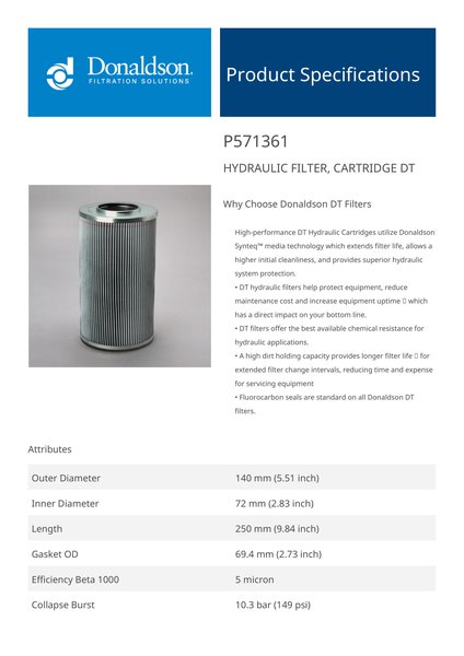 Genuine Donaldson P571361 Hydraulic Filter, Cartridge Dt is engineered with advanced depth filtration technology, offering enhanced dirt retention and fluid cleanliness. It ensures optimal performance in high-pressure hydraulic systems, effectively protecting critical components from wear and extending system life.