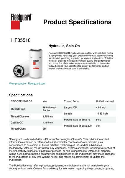 Fleetguard® HF35518 hydraulic spin-on filter with cellulose media is designed to help keep your precision hydraulic systems running as intended, providing a solution for various applications. This filter meets or exceeds the equipment OEM quality and performance and is the first aftermarket replacement available on the market today, bringing your operation top-quality performance and an overall unbeatable total cost of ownership.Specification