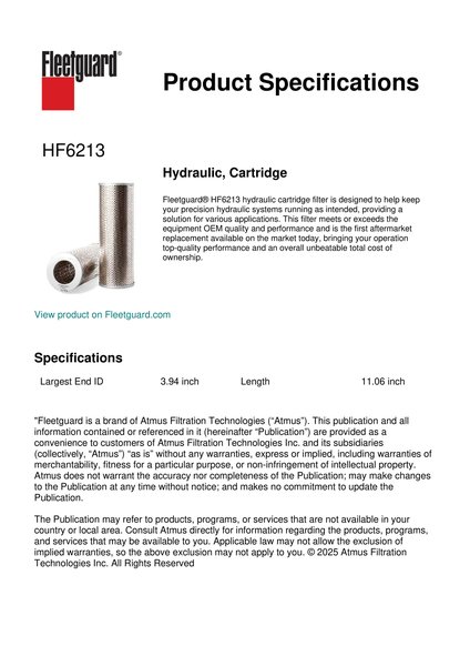 Fleetguard® HF6213 hydraulic cartridge filter is designed to help keep your precision hydraulic systems running as intended, providing a solution for various applications. This filter meets or exceeds the equipment OEM quality and performance and is the first aftermarket replacement available on the market today, bringing your operation top-quality performance and an overall unbeatable total cost of ownership.Specification