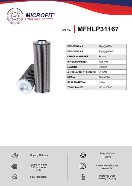 Genuine MICROFIT® UltraGen III MFHLP31167 DIN Pressure Filter. Engineered and manufactured in Great Britain the MFHLP31167 is designed to meet or exceed the quality and performance of OEM quality standards, ensuring superior filtration performance and the longest possible filter life.Building on over 50 years of filtration expertise, the UltraGen III series is the third generation of MICROFIT® filter media, delivering exceptional efficiency and reliability.